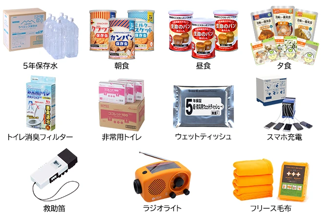 人数×3日間分を基本に、水・食糧のほか、寝袋・トイレ・救急箱・発電機など、重要度の高い物を一段目とし、目標を設定して計画的に充実をはかりましょう。