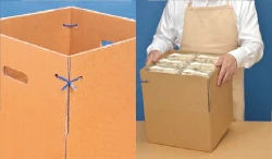段ボール箱のフタを立て、画像のように2か所に針金入ビニール紐で留めると、運搬用の箱としてお使いいただけます。